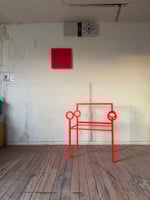 aiming for center, i made a single strike against the aluminum panel with the nearest axe. i coated the panel in solid RAL 3018 (strawberry red) and then feathered its edges with a fluorescent pink color